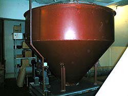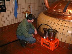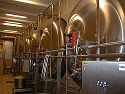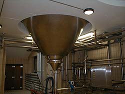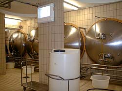 比重計測のようす麦汁は冷却された後、発酵タンクに入れられ、そこで酵母が加えられ、第1回目の発酵が行われて麦汁がビールに変化します。この発酵は14℃〜20℃で5〜6日間かけて行われます。発酵タンクは、蓋の無い開放型のものと近代的な円錐形(を逆さにしたもの)で密閉されたもののどちらかが用いられます。今飲んでいるOrvalがどちらのタンクで発酵されたかを想像しながら飲むのも楽しいのではないでしょうか。なお、どちらの発酵タンクを用いても品質やテイストは同一になるように努力されているとのことです。特に開放型のものは、厳重に管理された密室に置かれており、関係者以外はテレビカメラを通してでないと見ることができません。しかし、開放型のタンクはEUにより規制される可能性があるとのことで、今後どうなるかはわかりません。
