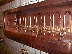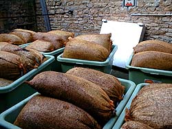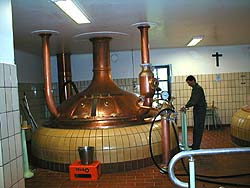 緑Orvalが飲める“A l'Ange Gardien”さて、醸造所の様子を見てみましょう。ビールの原料はモルト(ピルスナーモルト75%、クリスタルモルト25%)、ユーゴスラビアやドイツ産のホップ、そして前述の通りマチルダの泉からくみ上げられた水です。まず、モルトをミルで粉砕し、煮込んで糖分を抽出します。この作業は毎朝5時に始められます。その後温度を下げ、62℃〜70℃のあたりで1時間かけて1回目のフィルタリングを行います。この時約4000リットルの麦汁が得られます。次いで、7000リットルのお湯を加え、さらに2時間フィルタリングを行い、合計11000リットルの麦汁が得られます。